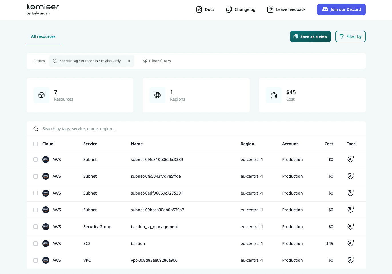 Regardless if you are a Developer, DevOps, or Cloud engineer. Dealing with the cloud can be tough at times, especially on your own. If you are using Tailwarden or Komiser and want to share your thoughts doubts and insights with other cloud practitioners feel free to join our Tailwarden discord server. Where you will find tips, community calls, and much more.