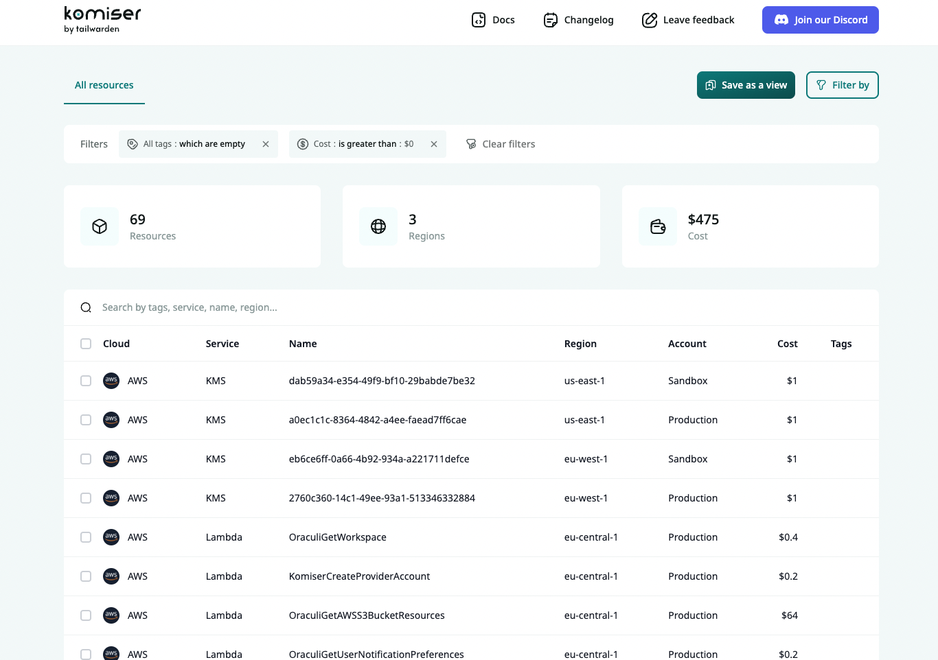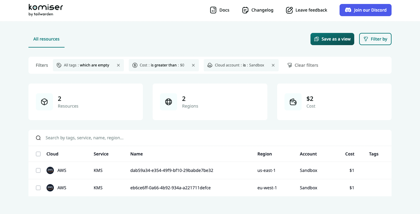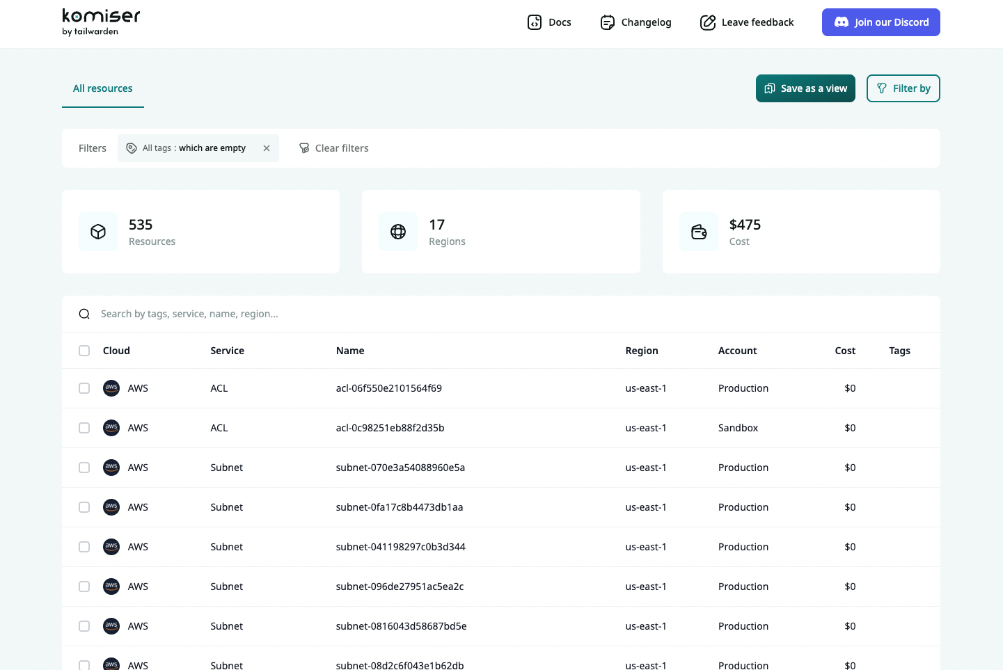 With Komiser, you can search for non-tagged AWS resources by using the “All tags” field combined with the "which are empty" operator.